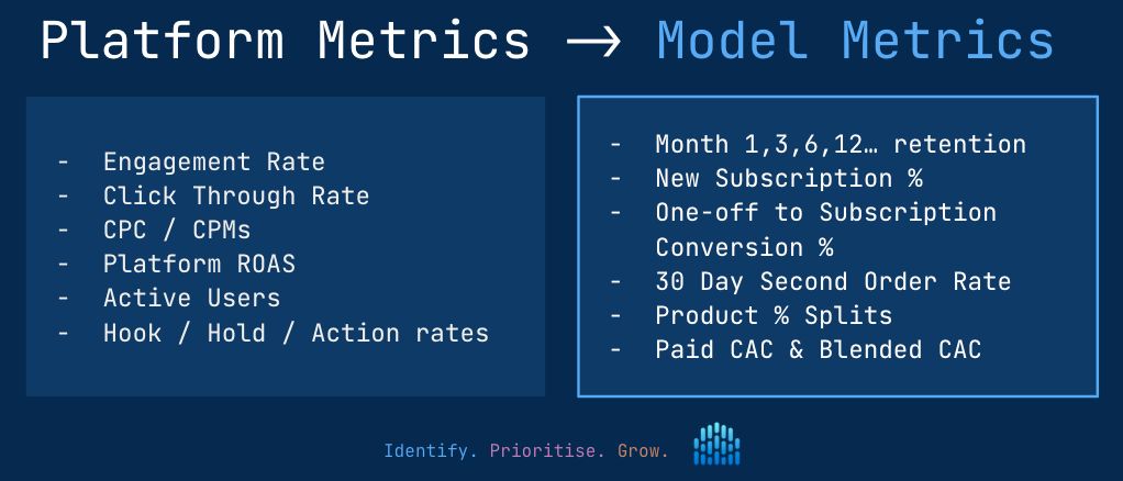 Model-first metrics come from a different place. They come from your forecast or growth model, specifically the assumptions and inputs within it. Things like month-1 and month-6 retention rates, product mix percentages (which materially affect AOV), the proportion of first-time customers choosing subscription versus one-off. These are the metrics that directly affect whether you hit your forecast. Be ruthless here. Default to deletion.